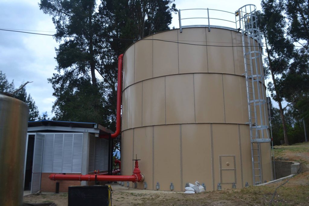 Ensamble de tanques modulares pernados para almacenamiento de agua contra incendio, con diseño adaptable y montaje eficiente.